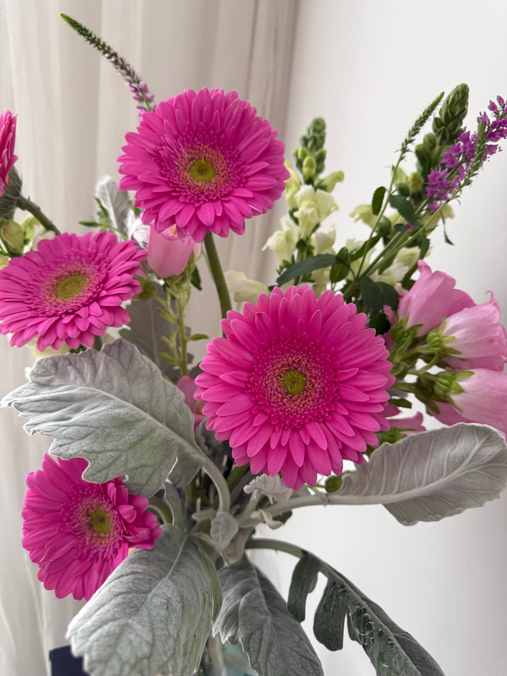 Las gerberas rosadas simbolizan ternura, gratitud y alegría, mientras que la combinación de texturas y colores de las flores complementarias aporta frescura y armonía visual.
